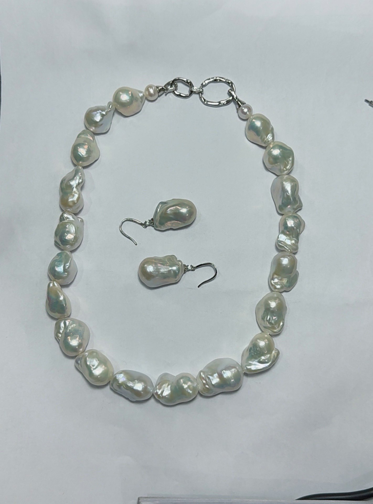 Every pearl in this collection is handpicked for its extraordinary aurora luster—a radiant, iridescent glow that transforms with every angle, casting ethereal rainbow hues across the uniquely shaped surfaces. The 18-inch necklace features large baroque pearls (15-17mm W × 18-25mm L), strung to perfection and finished with a secure 925 sterling silver clasp. The matching drop earrings, with 17×24mm aurora-luster pearls set in hypoallergenic 925 silver hooks, complete the set for a cohesive, statement-making look.