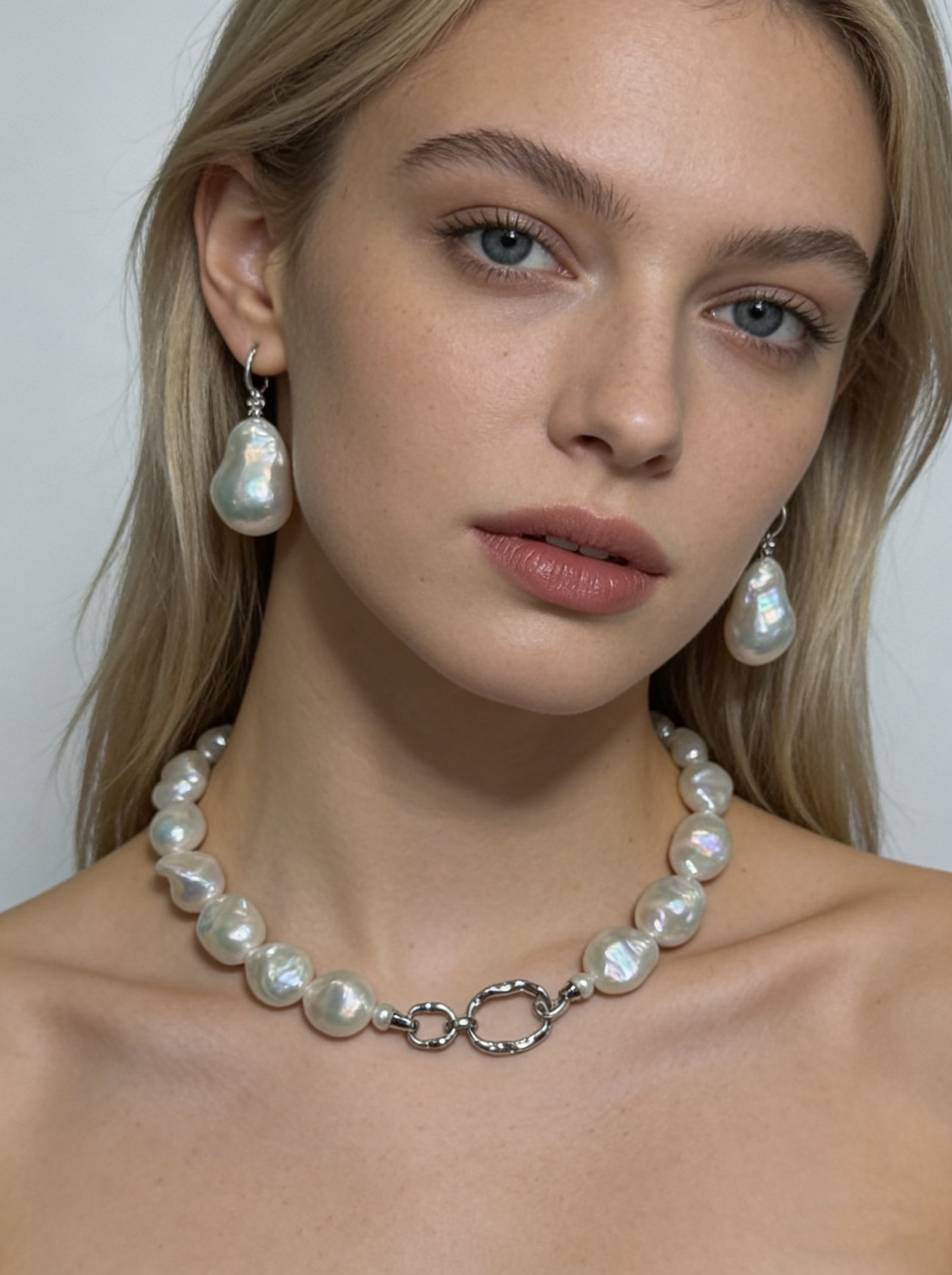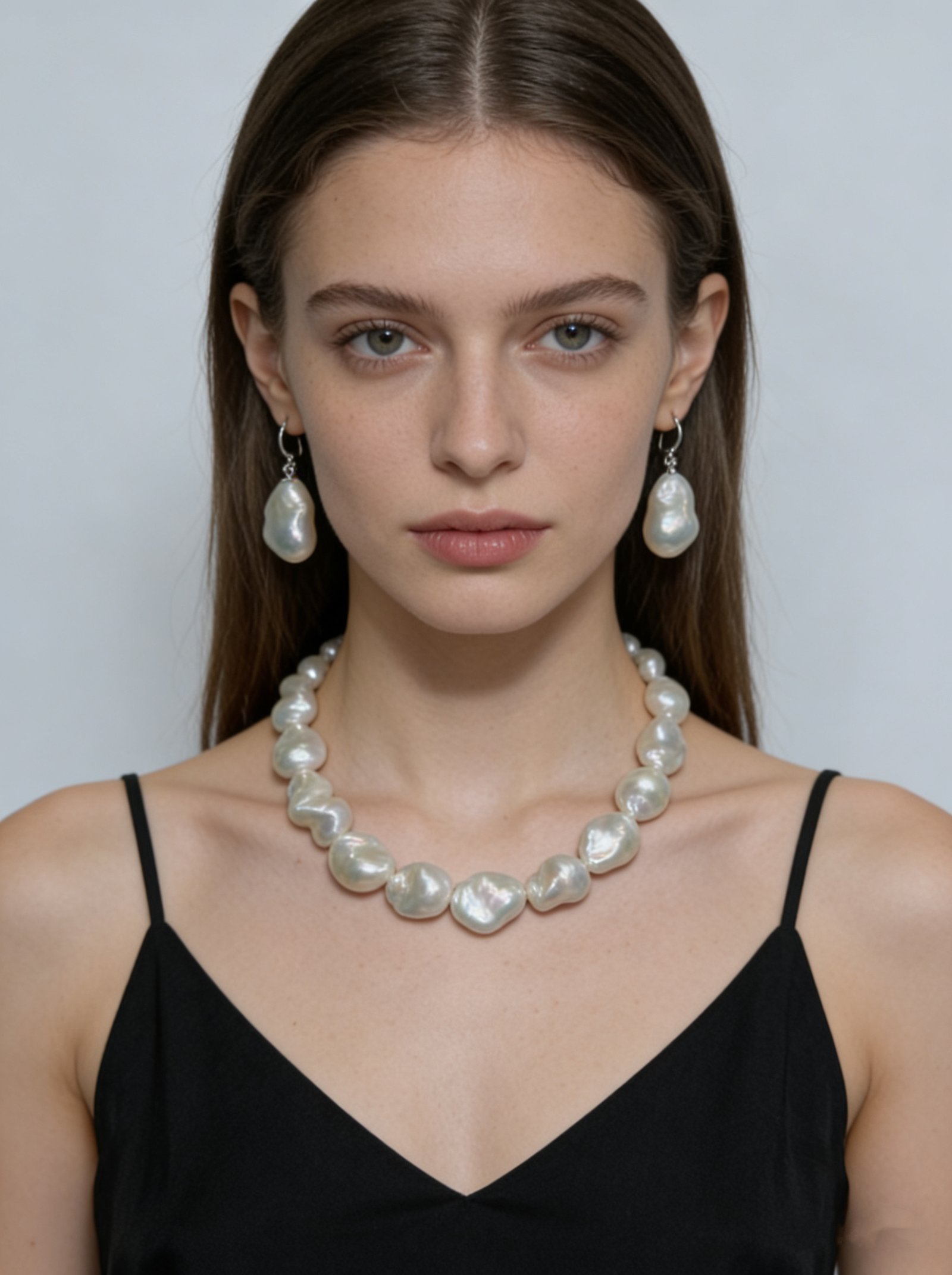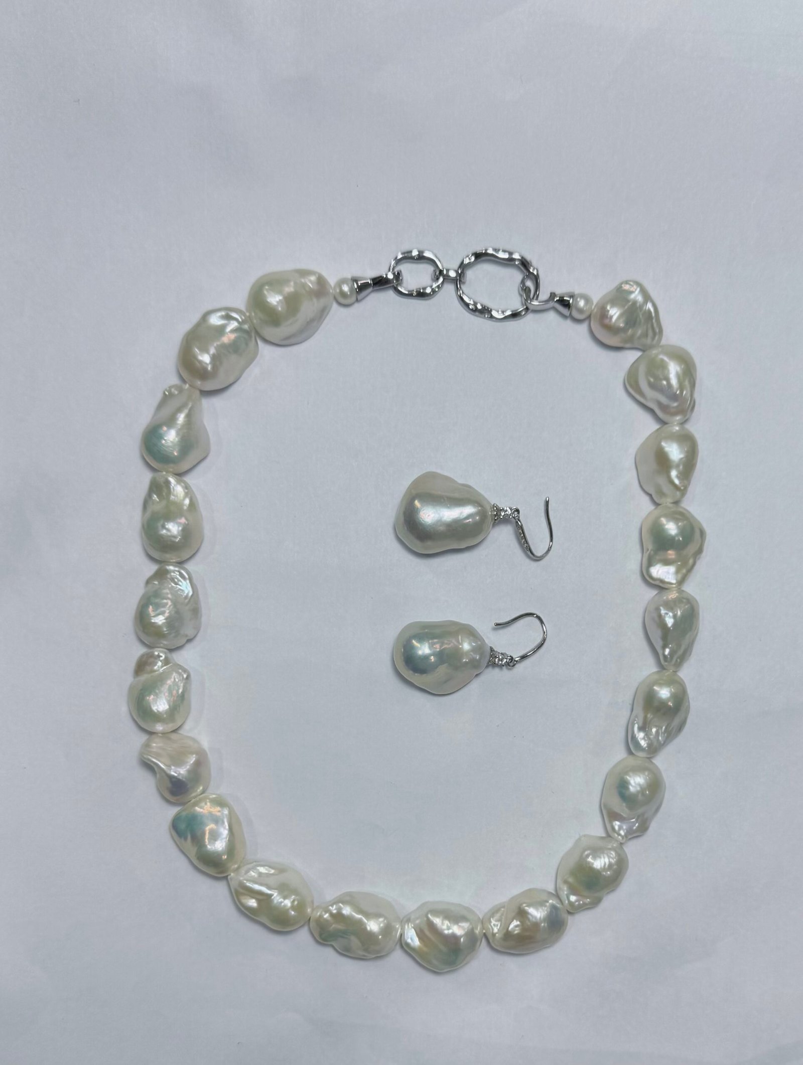 The 18-inch statement necklace features large, one-of-a-kind baroque pearls (15-17mm W × 18-24mm L), strung to perfection and finished with a secure, stylish 925 sterling silver clasp. The matching drop earrings showcase oversized, perfectly coordinated baroque pearls (19mm W × 23mm L), set in hypoallergenic 925 sterling silver hooks for comfortable, everyday wear.